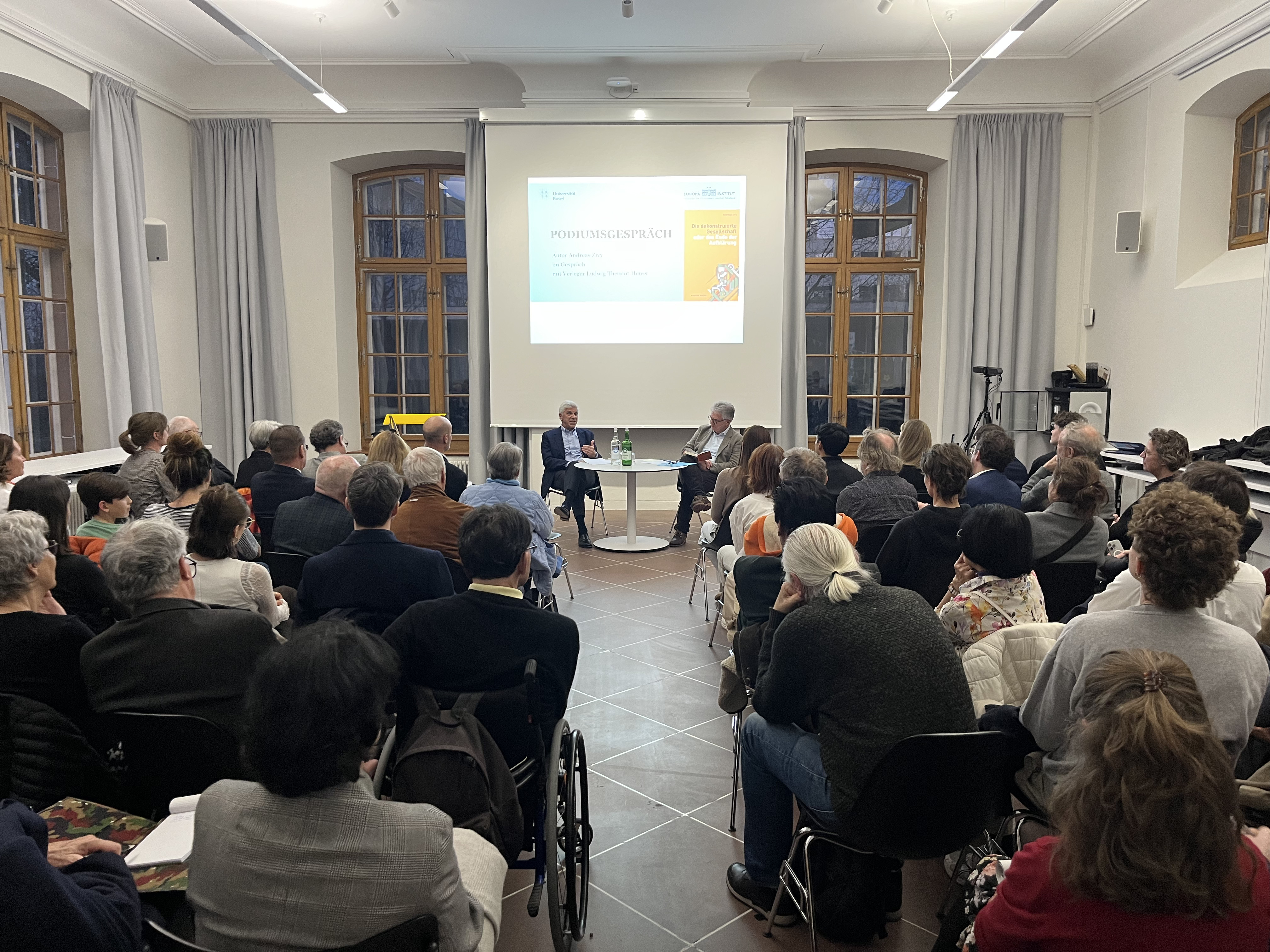 Im Zentrum der Veranstaltung stand dabei die Vernissage des Buches von Andreas Zivy mit dem Titel «Die dekonstruierte Gesellschaft oder das Ende der Aufklärung» (Oktober 2025). Der internationale Handelsunternehmer aus Basel las aus dem Buch einige besonders pointierte Passagen vor, bevor ein längeres Gespräch zwischen ihm und dem Moderator, Prof. Dr. Ludwig Theodor Heuss, seinerseits Verleger des Schwabe Verlags und Vorsitzender der Theodor Heuss Stiftung und des Kuratoriums der Friedrich-Naumann-Stiftung für die Freiheit, seinen Anfang nahm.